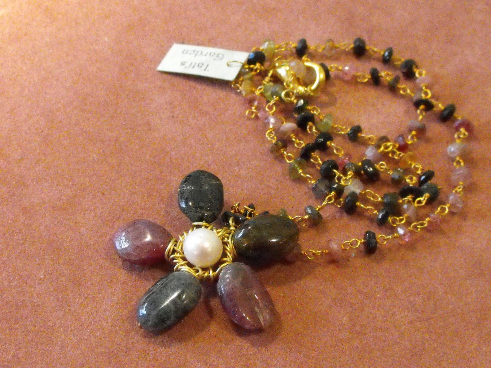 Μενταγιόν, βραχιόλι και σκουλαρίκια μαργαρίτες από τουρμαλίνες και μαργαριτάρι